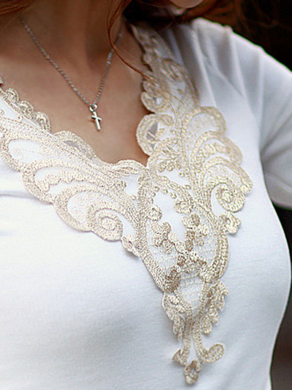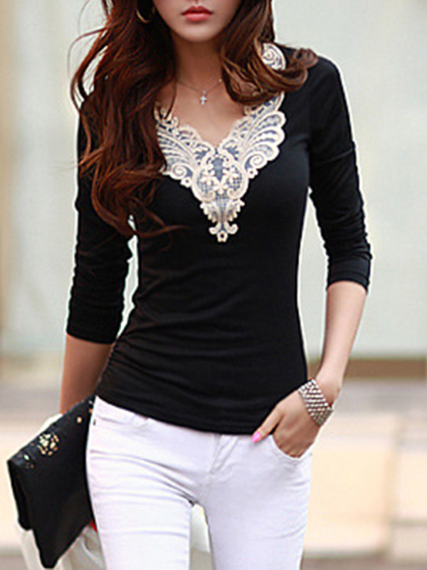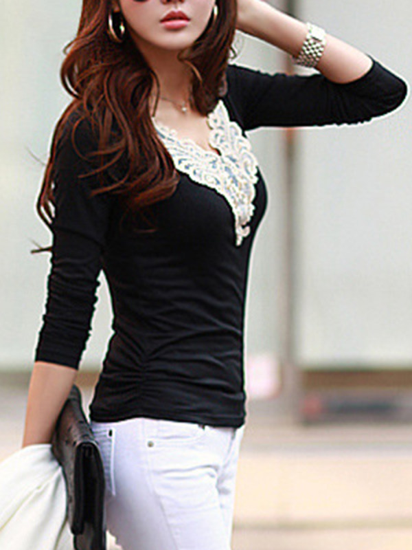 60% Off Autumn Spring Cotton Blend Women V-Neck Decorative Lace Plain Long Sleeve T-Shirts